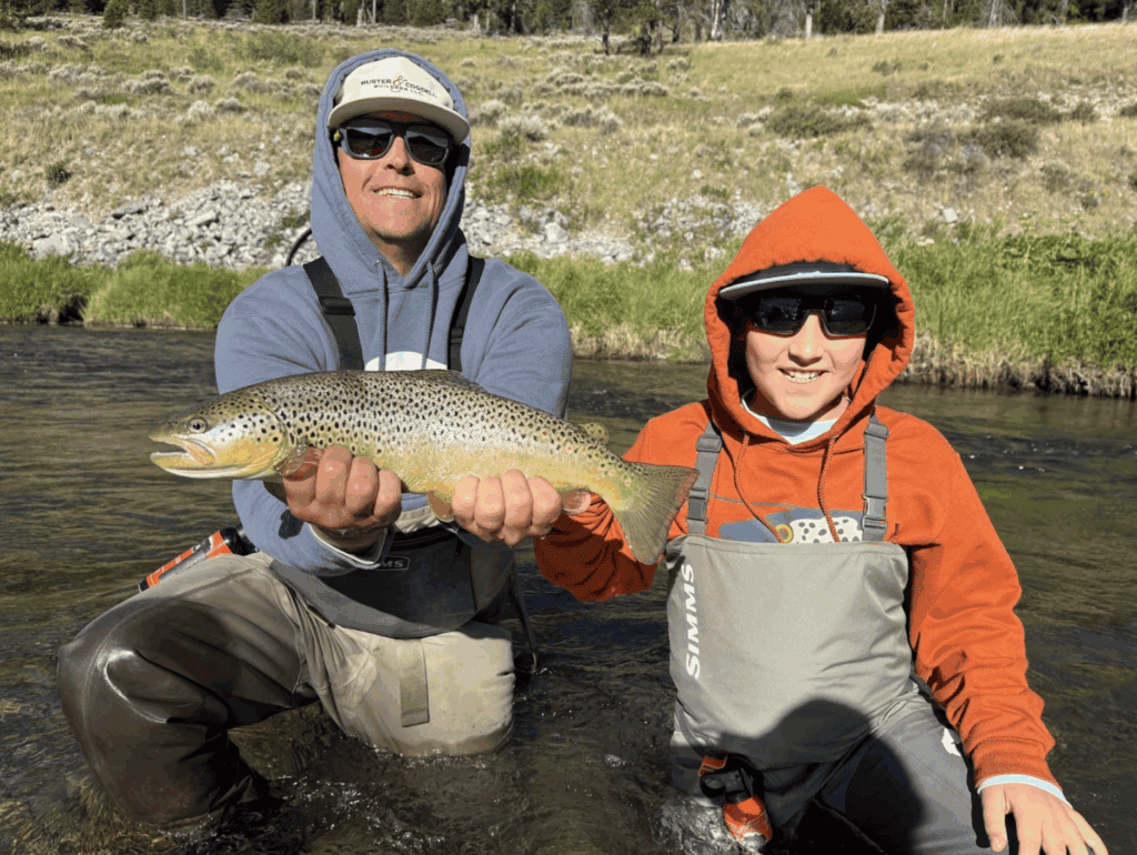 Return clients, father and son, landed this larger-than-average brown on the Gallatin River in Yellowstone National Park in July on a wade-fishing trip.