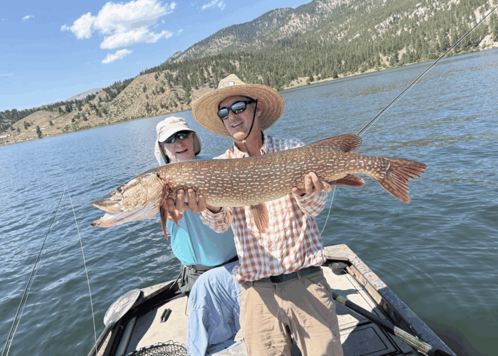 Longtime client Bernie landed the 40″ northern pike unexpectedly on Upper Holter Lake on 3x with a balanced leech about 3′ beneath the strike indicator. Incredible that the fish did not break the tippet with its sharp teeth.