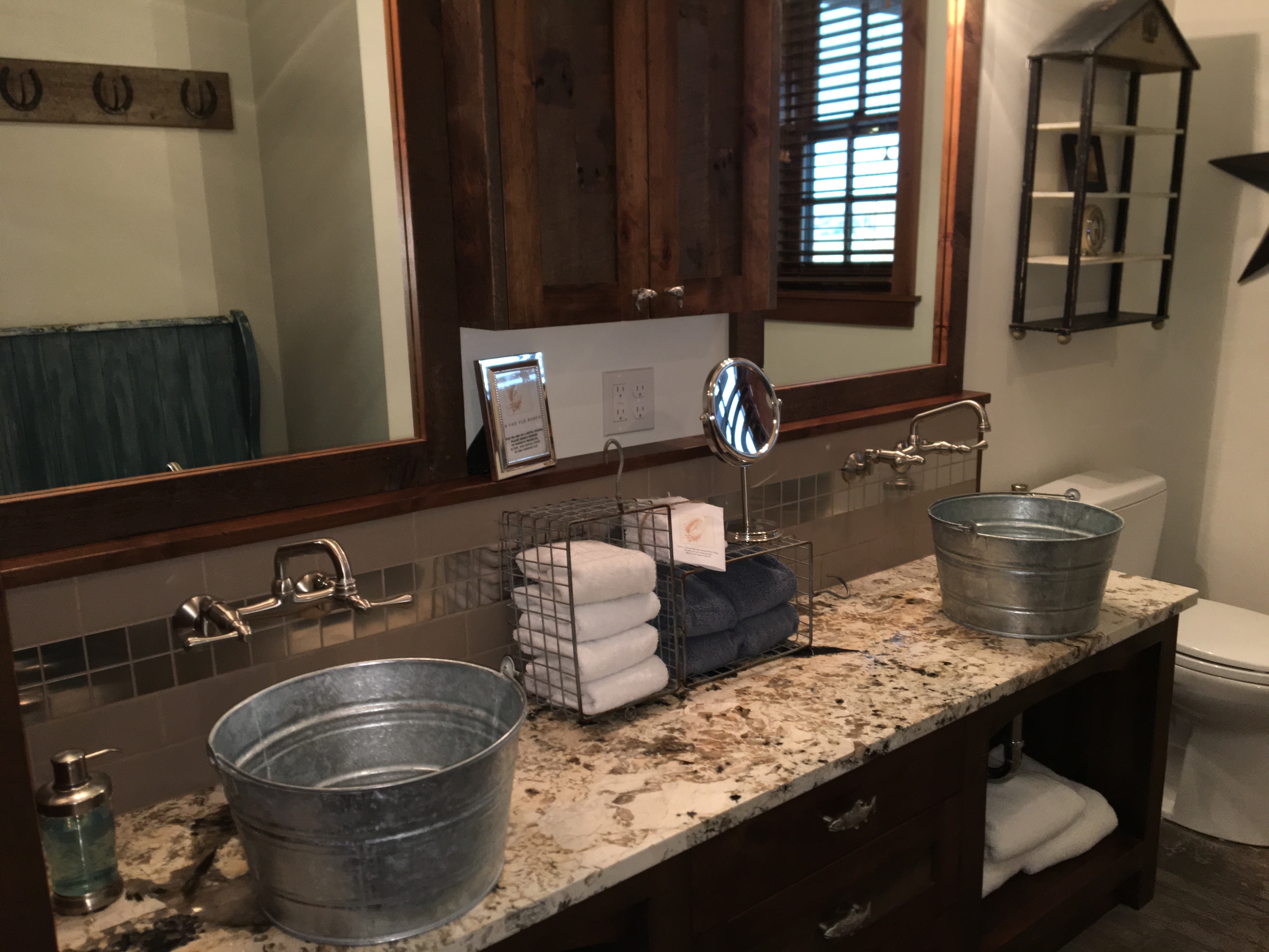 Secluded on 20 private acres with 360˚ mountain views, there’s a bunkroom (with six double beds), extra large bathroom with double sinks, tub, shower, washer, and dryer.